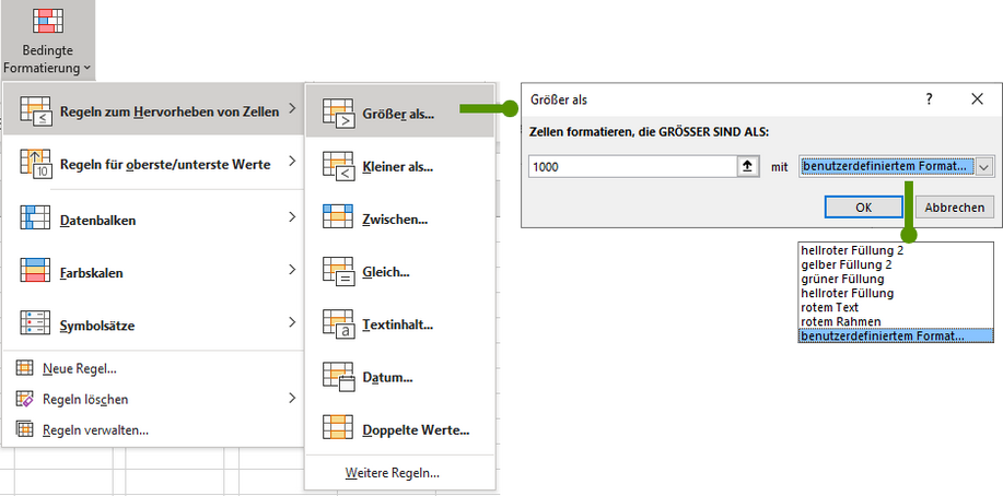 - Wählen Sie den Eintrag Regeln zum Hervorheben von Zellen und anschließend Größer als...