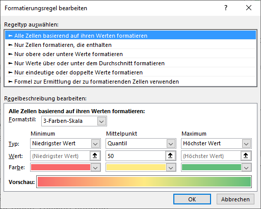 - Die Definition des Minimums, Maximums bzw. Mittelpunkts (bei der 3-Farben-Skala) erfolgt per Eingabe als Niedrigster | Höchster Wert, Zahl, Prozent (0-100), Formel bzw. Quantil (0-100).