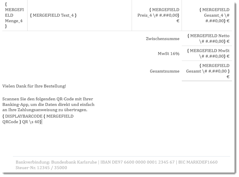Nach der letzten Rechnungsposition erfolgt die Summierung und ganz unten die Ausgabe des QR-Code:
